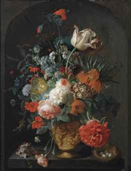 | Roses, tulips, anemones, irises, ranunculus, a larkspur, a hyacinth, auricula, a peony, a Crown Imperial lily and other flowers | |
