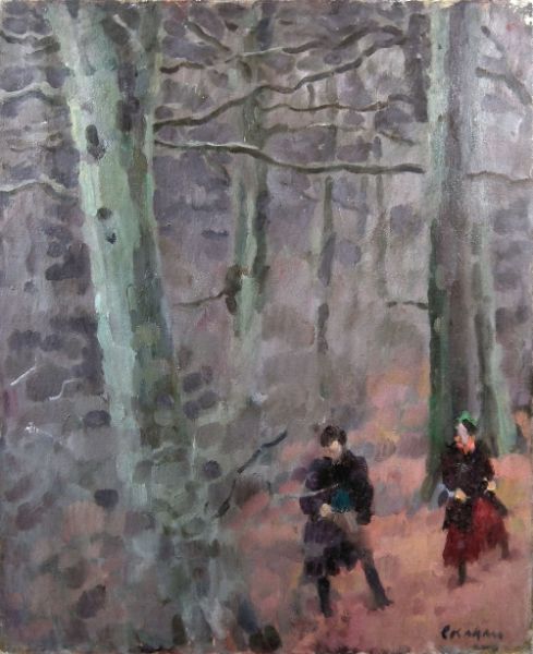 | Woodland scene with two figures to foreground and woodland scene at day time | |