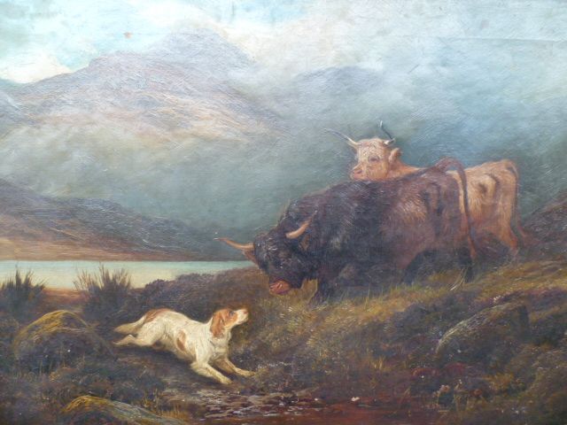 Highland cattle and a spaniel by a Highland loch