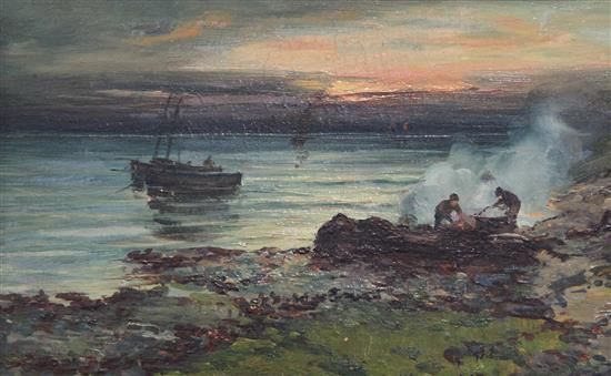 | Coastal landscape with figures lighting a fire and moored fishing boats | |
