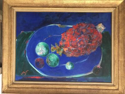 | Composition à l'assiette bleue et à l'ananas rouge | |