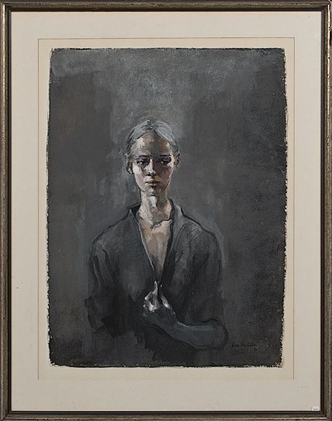 A portrait of a woman done in grey against a grey background