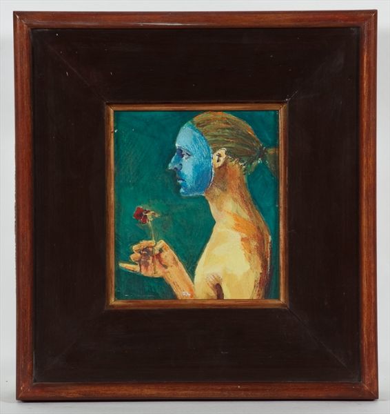 SELF PORTRAIT WITH PAINTED FACE HOLDING A FLOWER