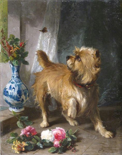 A Norwich terrier chasing a butterfly