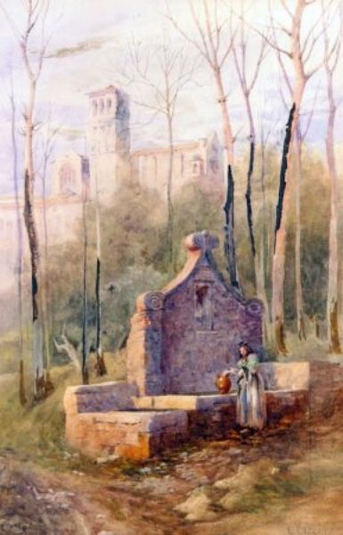 A Woman Collecting Water from a Village Well, Church Buildings in Distance