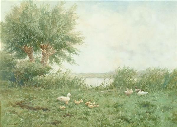 Ducks and ducklings on the river bank