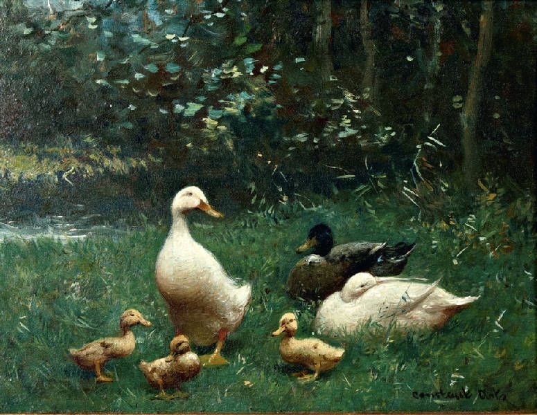 Eendenfamilie in het gras