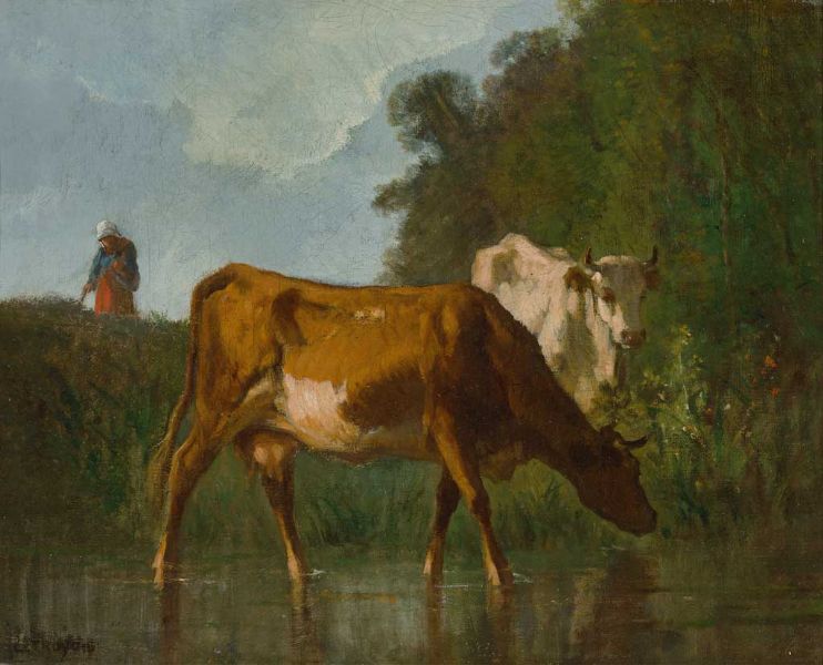 Zwei Kühe an der Tränke an einem Sommertag, im Hintergrund die Hirtin