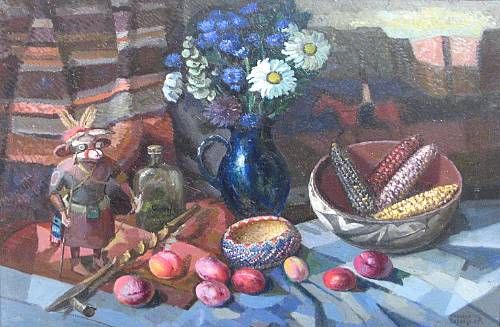 A Still Life of a Hopi Figure, Flowers, Fruit and Maize in a Clay Bowl