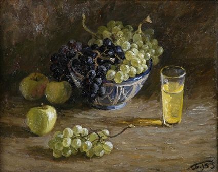 TABLETOP STILL LIFE WITH GRAPES AND APPLES