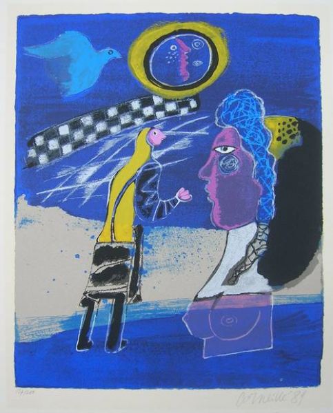 | A bird, the bust of a woman and a standing figure with the moon in the sky | |