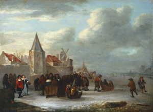 WINTERLANDSCHAFT MIT EISLÄUFERN VOR DEN MAUERN EINES HOLLÄNDISCHEN STÄDTCHENS