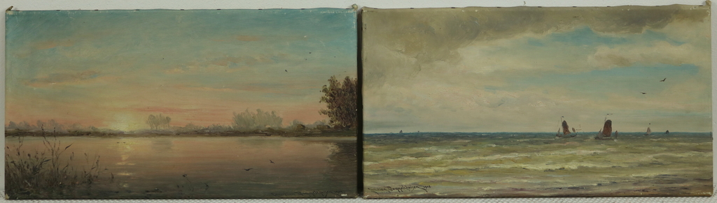 Visserboten op zee, Waterlandschap met ondergaande zon