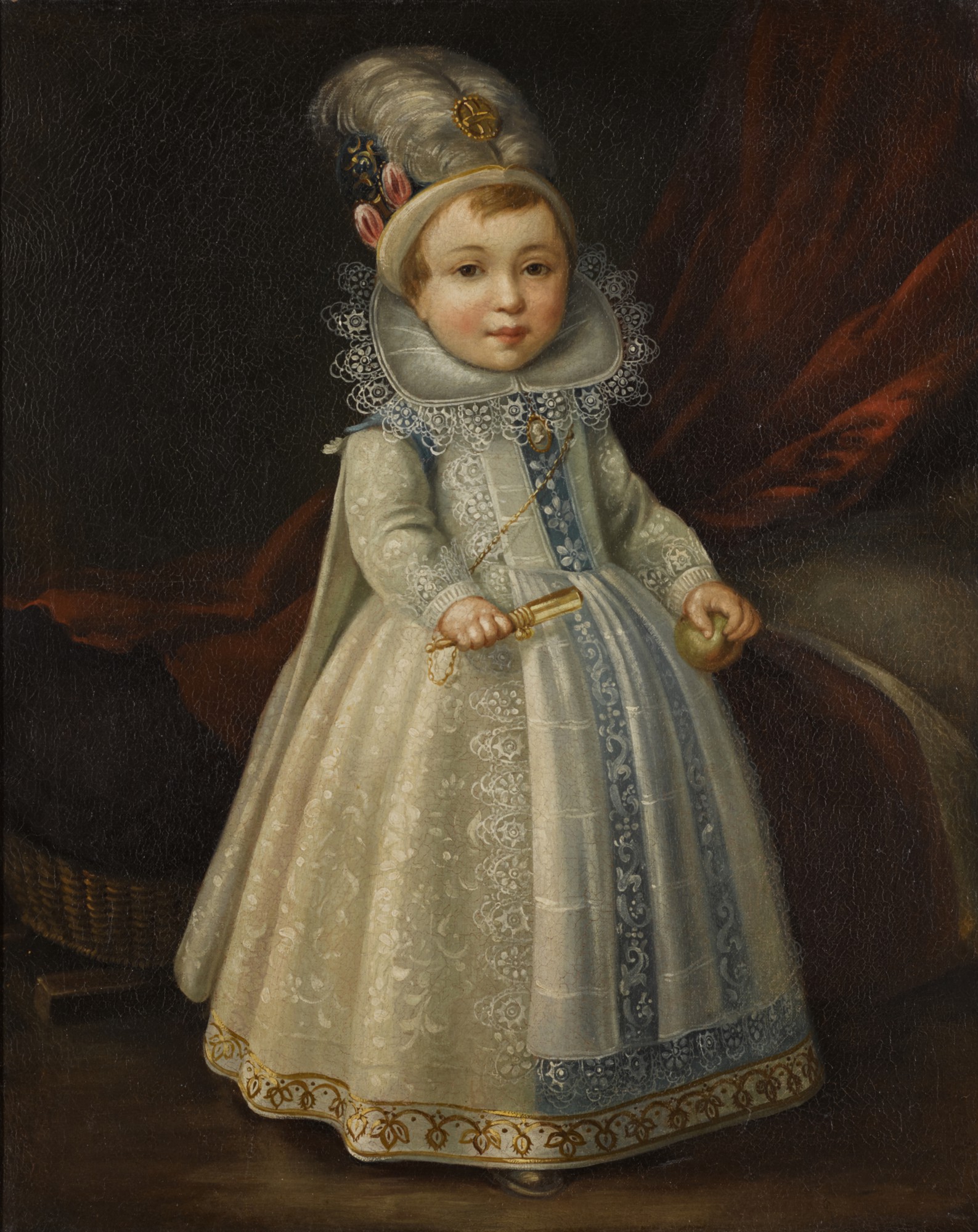 | PORTRAIT OF A YOUNG BOY, STANDING FULL-LENGTH, WEARING A WHITE DRESS WITH A LACE COLLAR AND FEATHERED HAT, HOLDING A RATTLE AND | |