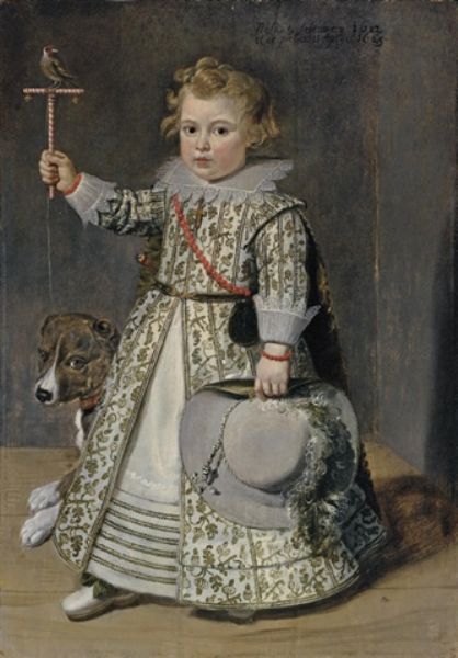 | Portrait of boy aged two, full-length, in a white embroidered dress decorated with acorns, holding a perch with a finch in his r | |