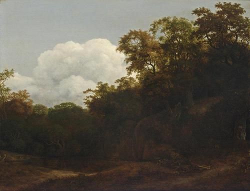 | A WOODED LANDSCAPE WITH A WATERFALL ENDING IN A FOREST POND | |