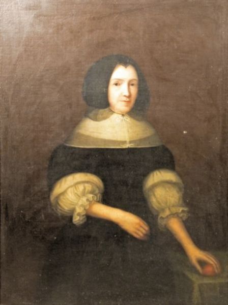 | PORTRAIT OF A LADY, THREE QUARTER LENGTH, IN A BLACK DRESS, WITH A WHITE COLLAR AND SLEEVES, HER LEFT HAND RESTING ON AN ORANGE | |