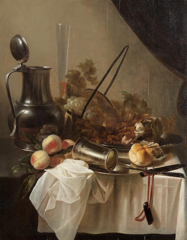 | A pewter jug with an overturned silver cup with fruit, bread and meat on a draped table-top | |