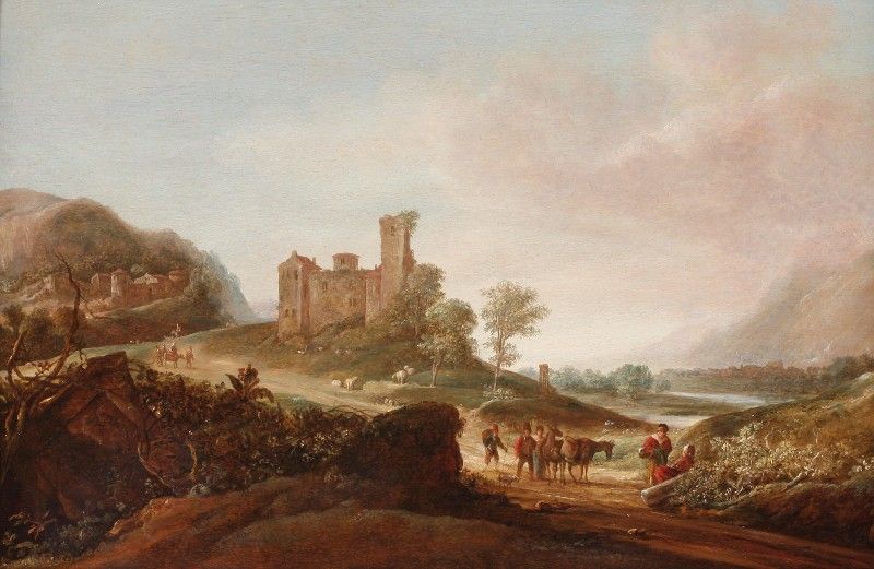 | A mountainous landscape with travellers in a lane, in the background a castle and a village at the horizon | |