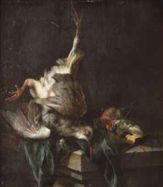 | A pigeon hanging, with two goldfinches and a green cloth on a stone ledge | |