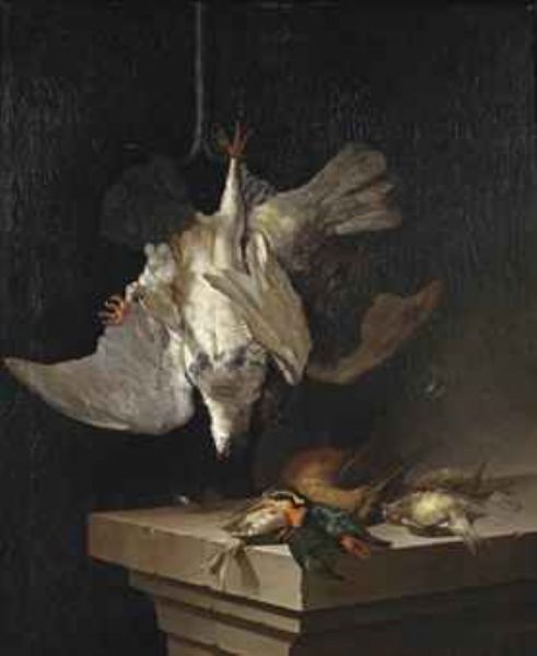 | Two partridges hanging, with a kingfisher, woodcock and other birds on a stone ledge | |
