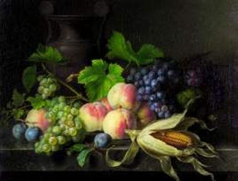 | Des pêches, du raisin et du blé de Turquie sur une table de marbre où l'on voit un vase de lave du | |