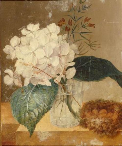 NATURE MORTE AUX VASES DE FLEURS ET NIDS D'OISEAUX SUR DES ENTABLEMENTS