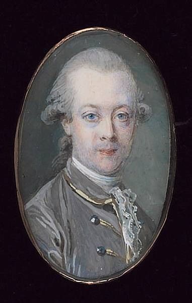 | A Gentleman, wearing light grey coat with gold edging and buttonholes, white lace cravat, his hair powdered and worn en queue | |