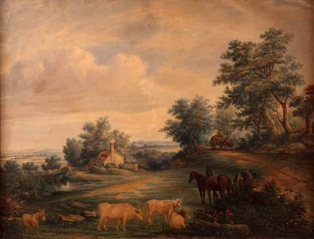 | Extensive Landscape with Horses, Donkey by a Cottage, Horse and Cart in Country Path and Windmill to Distance | |