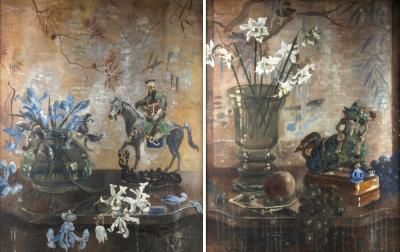 | Still life of 'Ming Dog with Daffodils'; and a companion painting of a Chinese figure on a horse and flowers | |