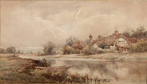 River landscape with cottage and figures