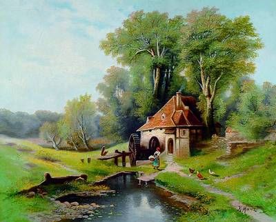 Bäuerin mit Federvieh an Wassermühle