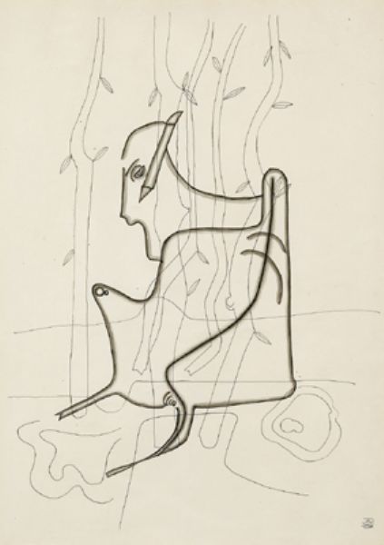 Pencil feather, paint brush, tusche, watered down tusche on paper