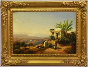 North African mountainous landscape scene with shrine and figures resting and carrying water