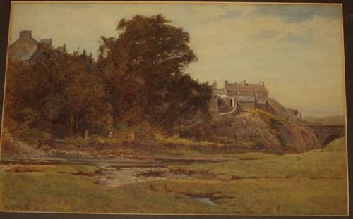 | River scene with houses and trees, with girls by the river bank, possibly Wales | |
