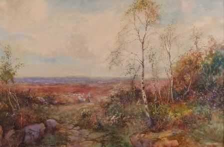 shepherd with sheep on open moorland, trees and flowers in the foreground
