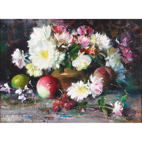 CHRYSANTHEMUMS APPLES AND GRAPES; CHRYSANTHEMUMS AND AN APPLE