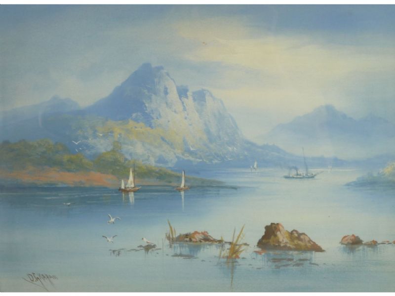 Continental lake scene with sailing boats, steam yacht, mountainous background