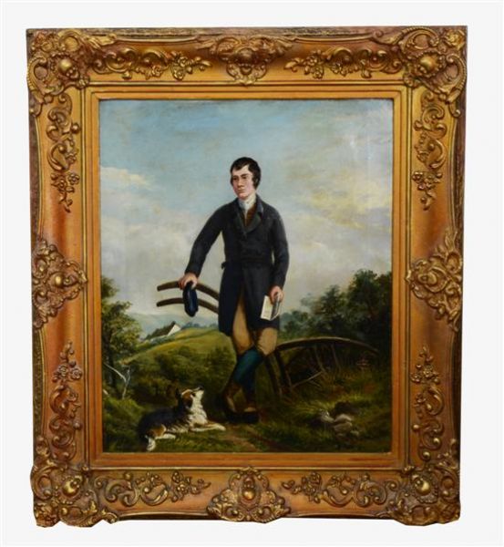 Portrait of Robert Burns, full-length, a poem in his left hand with a dog by his side