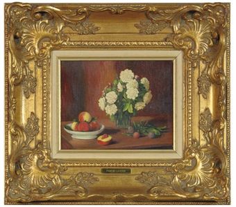 Still life with peaches, plums and flowers