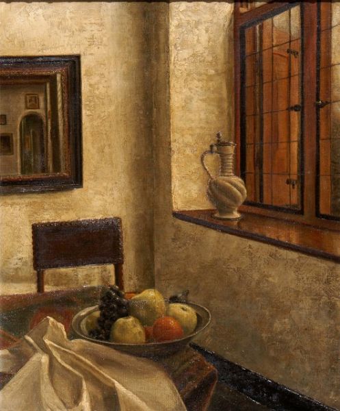 Interior scene with a pewter bowl of fruit and a pottery jug on window sill
