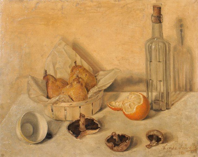 Still life with a basket of pears, three mushrooms, an orange and a glass flask
