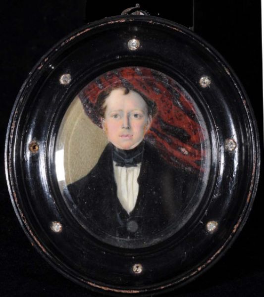 A MINIATURE BUST PORTRAIT OF A YOUNG GENTLEMAN WEARING A BLACK COAT POSED AGAINST A CRIMSON DRAPE