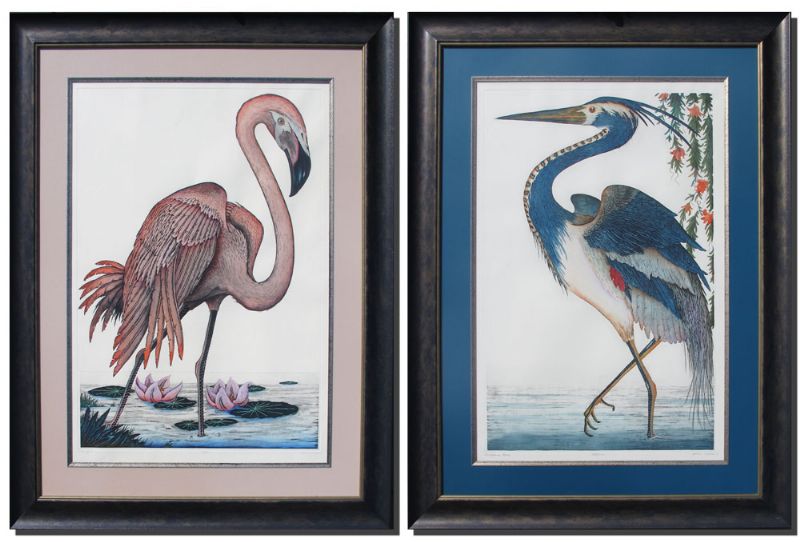 2 bird Etchings; Louisiana Heron, Flamingo A
