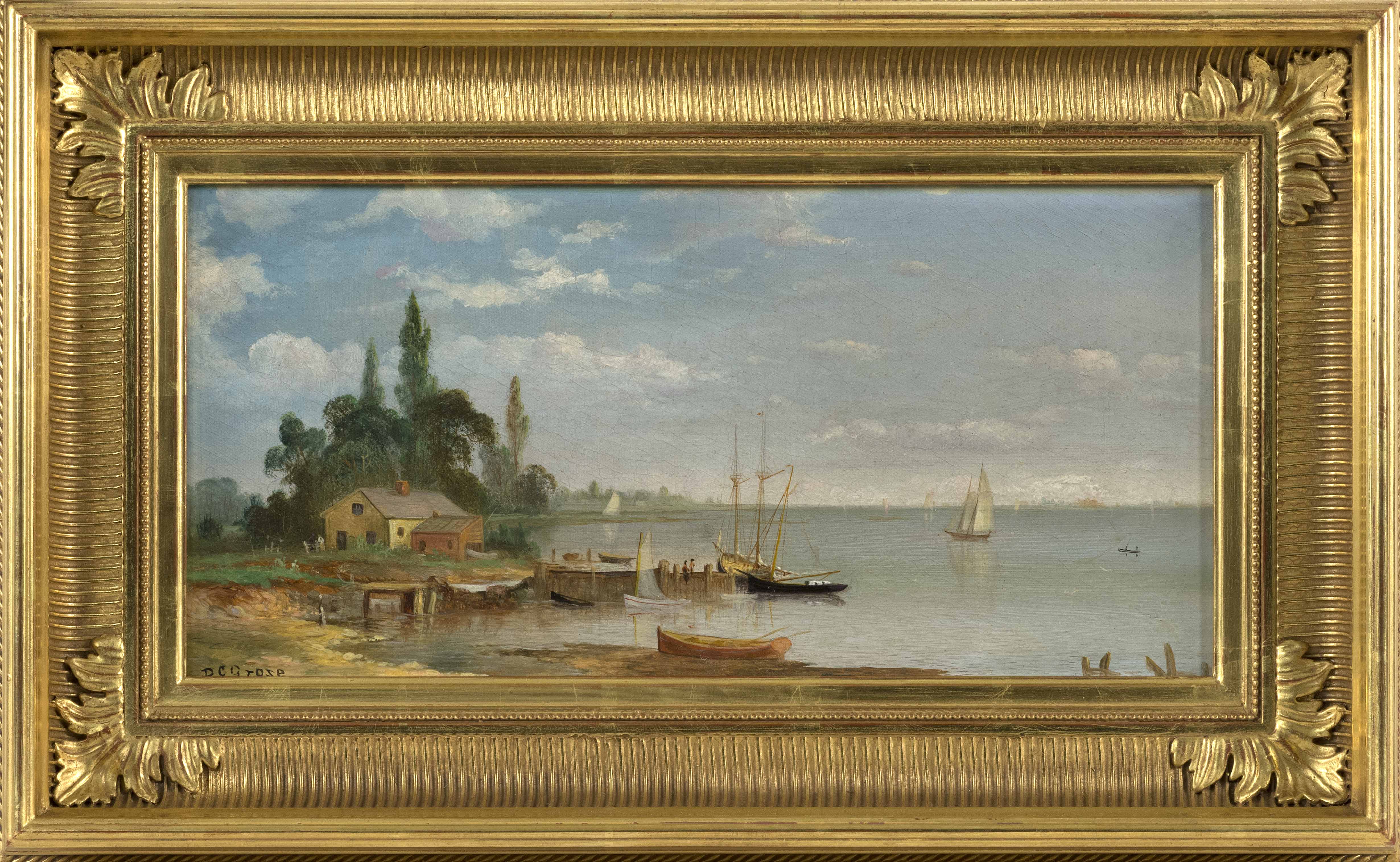 Shore scene with house, pier and numerous vessels