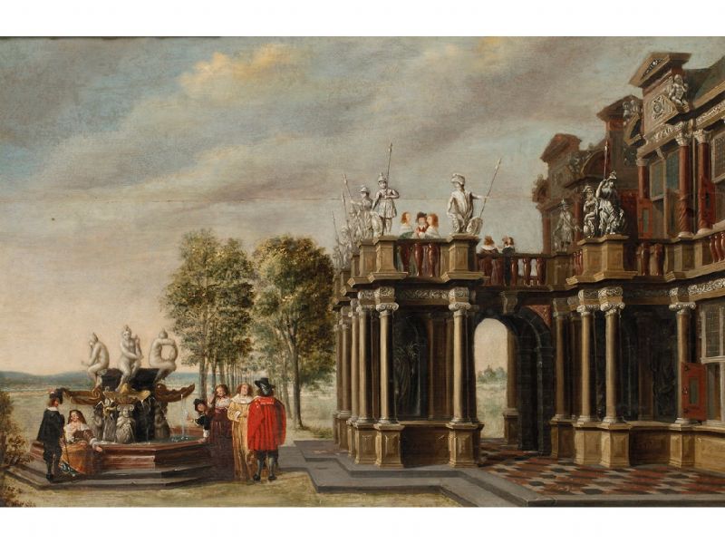 | Figures beside a fountain outside a classical building with landscape beyond | |