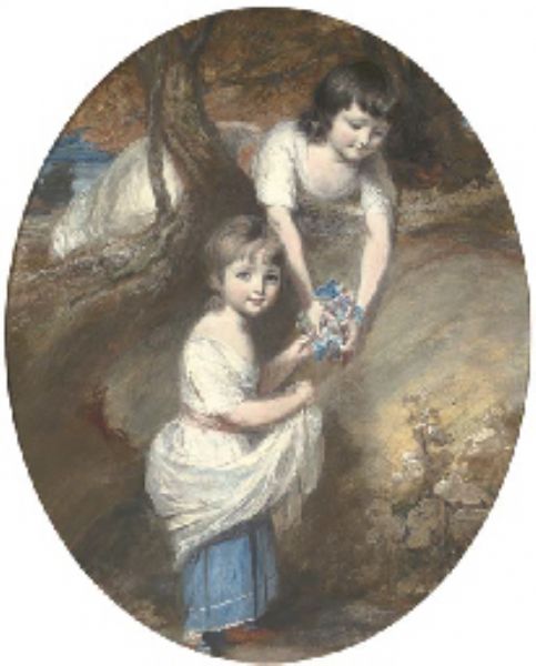 | Double portrait of Harriet and April Fortescue, full-length, in white dresses, gathering posies | |