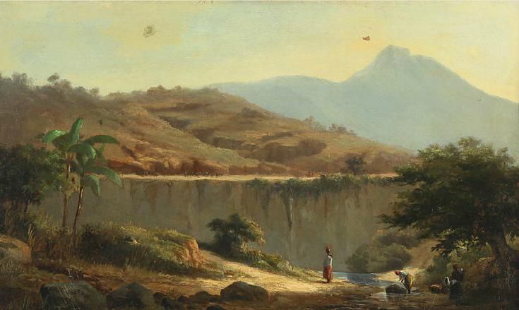 | Mountainscape with women washing clothes in the river, probably Marocco. | |