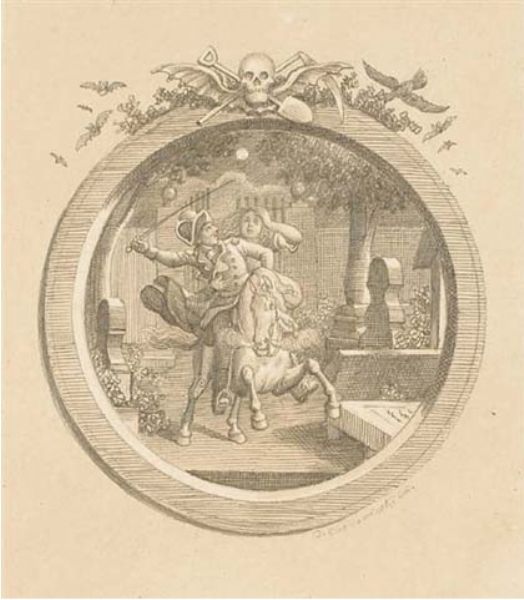 | Wilhelm and Leonore galloping through a graveyard, an illustration to Bürger's Leonore, in a trompe l'oeil frame surmounted by m | |