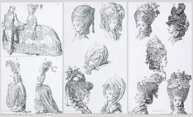 Zestaw trzech grafik przedstawiających damskie stroje i nakrycia głowy